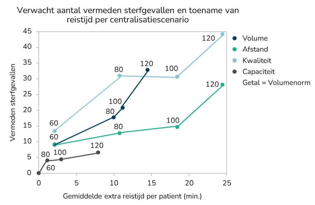 Met een simulatiemodel onderzocht Merlijn het verwachte effect van verhoging van de volumenorm tot 120 resecties per jaar op reistijd en sterfte (zie figuur). Vier centralisatiescenario’s werden onderzocht: herverdeling op basis van volume (patiënten centreren in hoog-volume ziekenhuizen), afstand (patiënten centreren in het dichtstbijzijnde ziekenhuis dat voldoet aan de norm), kwaliteit (patiënten centreren in ziekenhuizen met de laagste sterfte), en capaciteitsbehoud (spreiding van patiënten om zoveel mogelijk ziekenhuizen open te houden). Verhoging van de volumenorm tot 100 resecties leidt naar verwachting tot een maximale vermindering van 31 sterfgevallen per jaar (ongeveer 78% van de totale jaarlijkse sterfte), terwijl de gemiddelde extra reistijd beperkt blijft tot circa 17 minuten. Centralisatie op basis van kwaliteit, gebaseerd op huidige mortaliteitscijfers van ziekenhuizen, resulteerde in de grootste sterftereductie. Daarentegen resulteerde centralisatie gefocust op capaciteitsbehoud in de beperktste gezondheidswinst.
