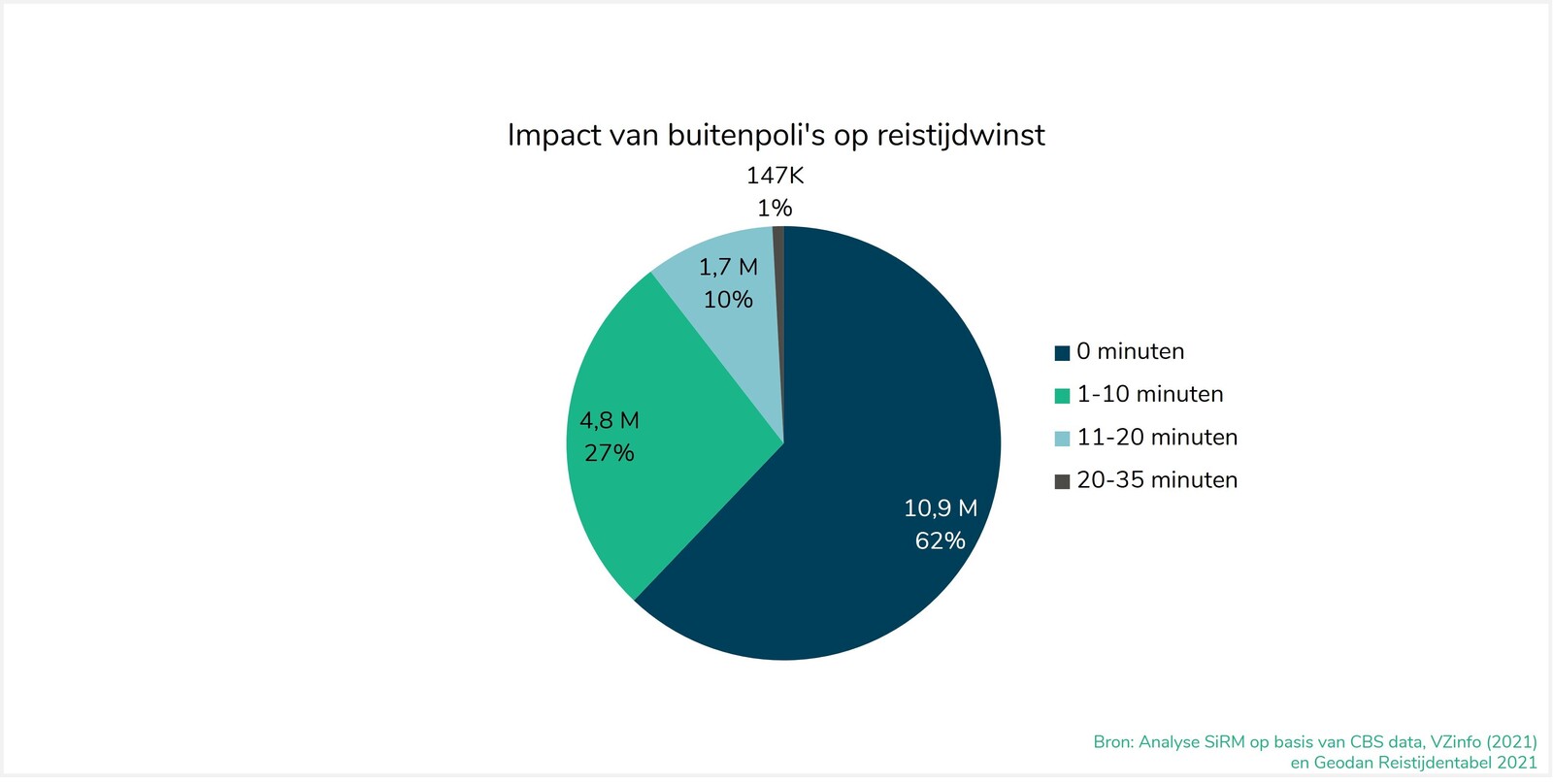 Deze reistijdwinst verschilt binnen deze groep van 7 miljoen mensen: voor circa 1,7 miljoen is dit tussen de 11 en 20 minuten en voor een kleine 150.000 mensen meer dan 20 minuten. Op vier plekken in Nederland levert een buitenpolikliniek een reistijdbesparing van 25 tot 35 minuten op. Dit betreft de buitenpoli’s op Schouwen-Duiveland, in de Noordoostpolder, in Noordoost Twente en op Texel. In totaal gaat dit om ruim 50.000 personen (0,3% van de totale bevolking in Nederland).