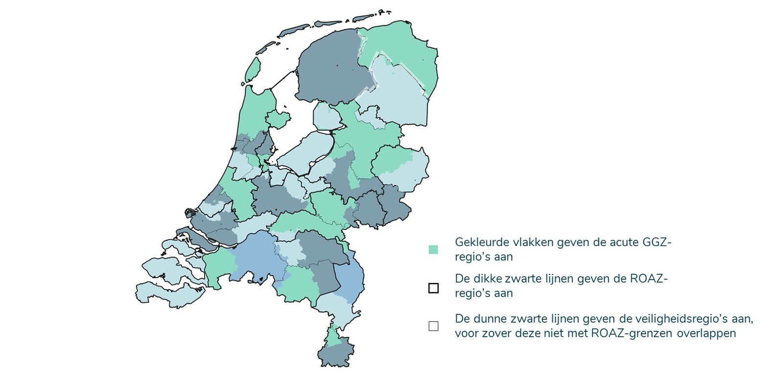 In de plaat zijn de acute GGZ-regio’s met gekleurde vlakken aangegeven. Met een dikke zwarte lijn zijn de ROAZ-regio’s aangegeven. Met dunnere zwarte lijnen zijn vervolgens de grenzen van de veiligheidsregio’s aangegeven, voor zover deze niet overlappen met de ROAZ-regio’s.