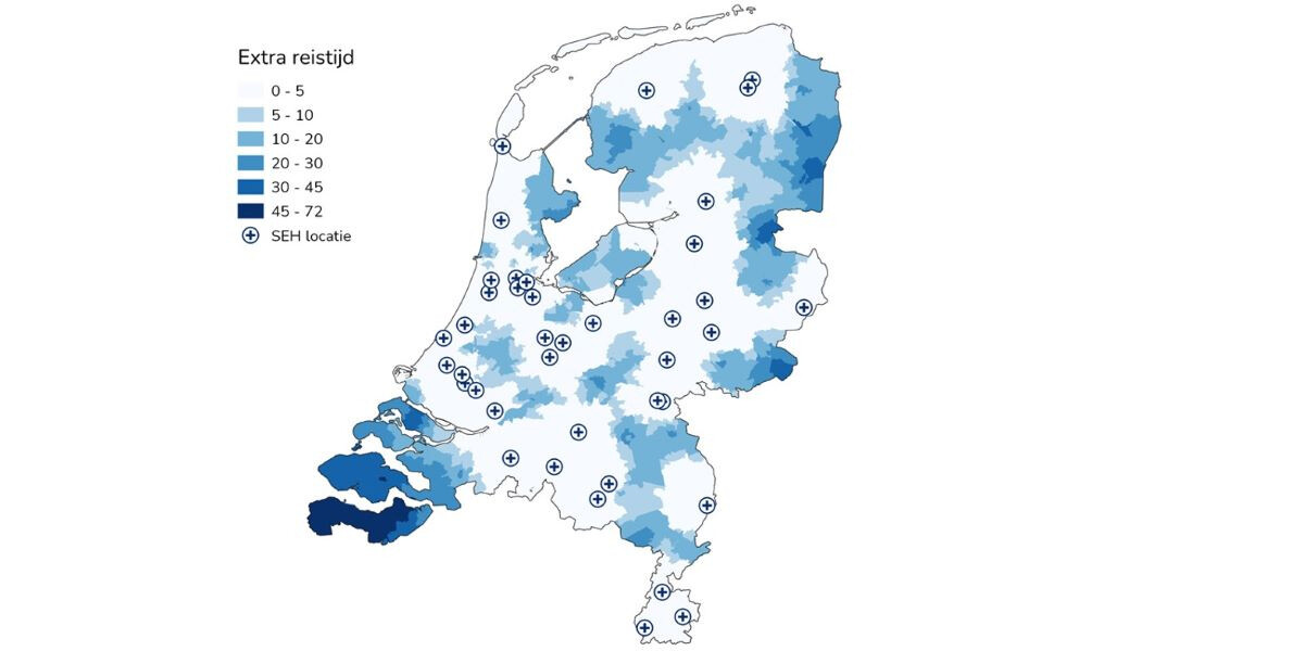 Voor patiënten neemt de gewogen gemiddelde reistijd naar de SEH met 5 minuten toe: van 12 minuten nu, naar 17 minuten bij deze 43 SEH’s. 91% van de Nederlandse bevolking zou een SEH binnen 30 minuten kunnen bereiken. Nu geldt dat voor 99% van de bevolking, circa 1,4 miljoen inwoners meer. De reistijd neemt het meest toe in Zeeland (zie figuur). Ook in het oostelijk deel van de Achterhoek, Noord-Oost Overijssel, Oost-Drenthe, Zuid-West Friesland en het noordelijk deel van Flevoland neemt de reistijd relatief sterk toe. Dit zijn tevens de gebieden waar de 30-minuten grens – die de Raad voor Volksgezondheid en Samenleving als maximale reistijd hanteert – overschreden zou worden.