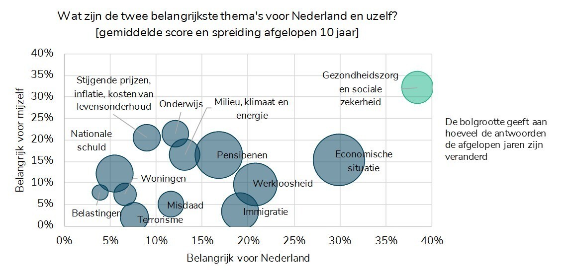 - Gezondheidszorg en sociale zekerheid staan ruim bovenaan het lijstje, zowel voor onszelf als voor Nederland. Bovendien is de spreiding relatief klein, wat betekent dat het belang van deze thema’s weinig gevoelig is voor de actuele maatschappelijke situatie.