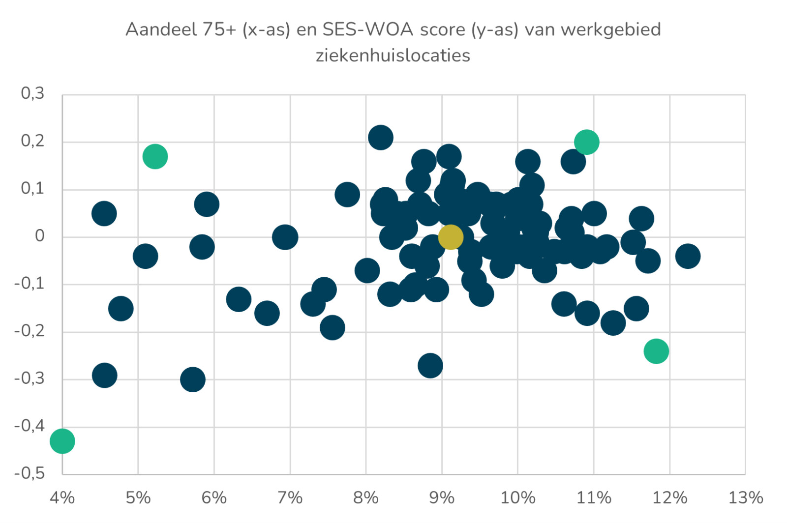 Ter illustratie bekijken we enkele uitbijters en het ziekenhuis met een werkgebied dat, qua vergrijzing en sociaaleconomische omgeving dichtbij het gemiddelde voor Nederland zit:
