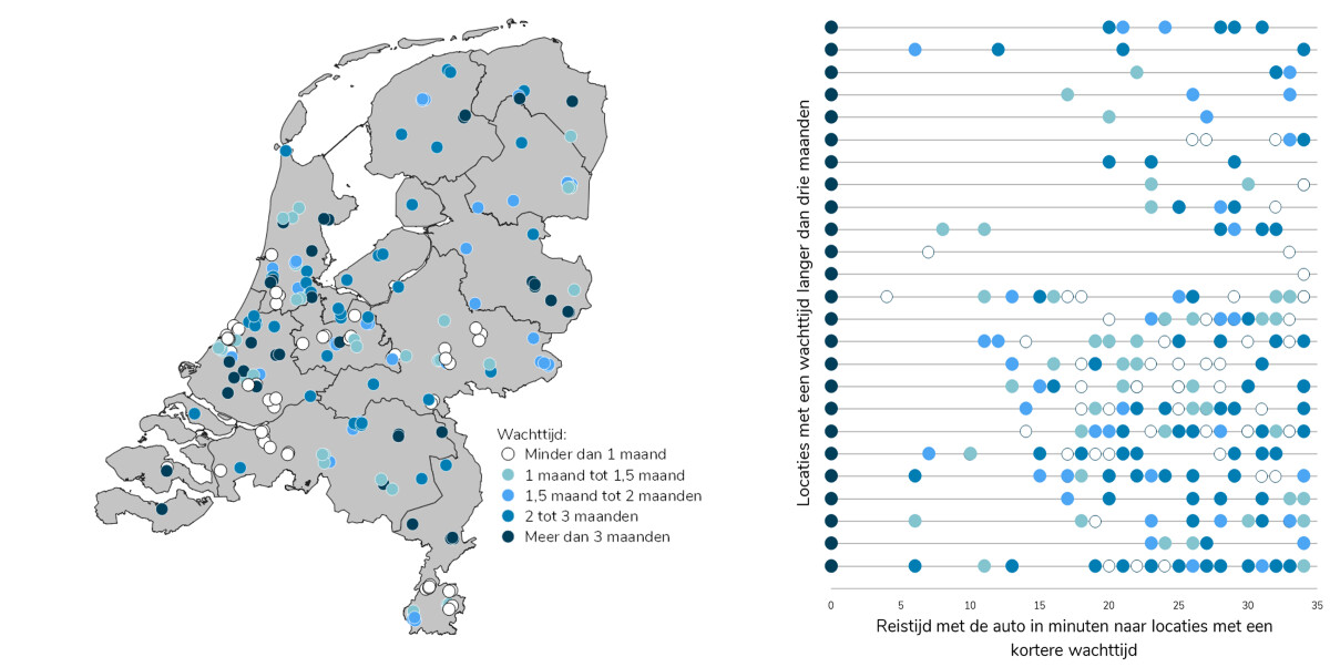 Links op de plaat van de maand, een kaart van Nederland, staat een bol voor iedere locatie waar staaroperaties worden uitgevoerd. De kleuren geven de wachttijden per locatie weer voor een initiële staaroperatie: Hoe donkerder de bol, hoe langer de wachttijd voor de operatie*. Een witte bol betekent een wachttijd korter dan 1 maand, de meeste donkerblauwe bol een wachttijd langer dan 3 maanden. Rechts staan per locatie met een wachttijd langer dan drie maanden (verticale as) alle locaties die een kortere wachttijd hebben binnen een reistijd van 35 minuten rijden (horizontale as). De plaat laat zien dat bij elke donkerblauwe bol altijd een bol uit één van de eerste drie categorieën (wachttijd van 2 maanden of korter) in de buurt ligt. Voor elke locatie met een wachttijd langer dan 3 maanden is er binnen een halfuur rijden een andere locatie met een wachttijd korter dan 2 maanden. In de Randstad is dit vaak zelfs een locatie met een wachttijd korter dan een maand.