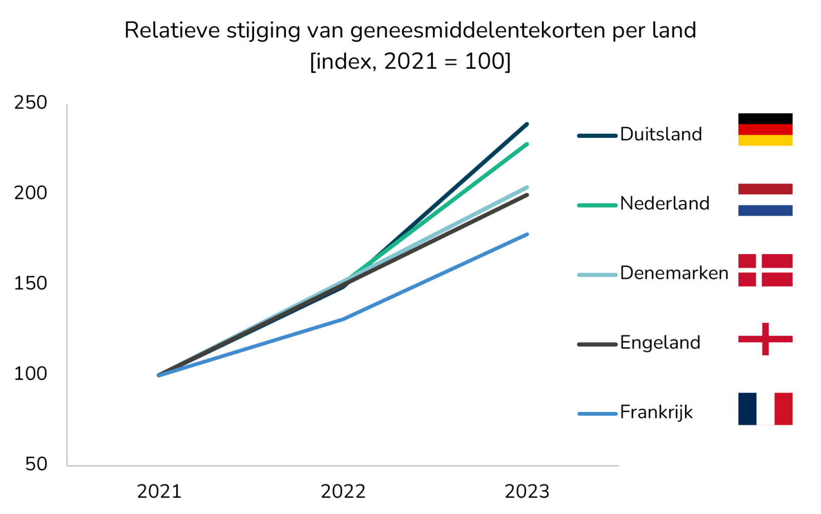 Het viel ons wel op dat, gegeven hun eigen definities, alle vijf landen om ons heen een vergelijkbare forse stijging van de geneesmiddeltekorten ervaren. Vanaf 2021 ongeveer 80% voor Frankrijk en 140% voor Duitsland. Voor Nederland was dat bijna 130%. België, Engeland en Denemarken lagen daar tussenin.
